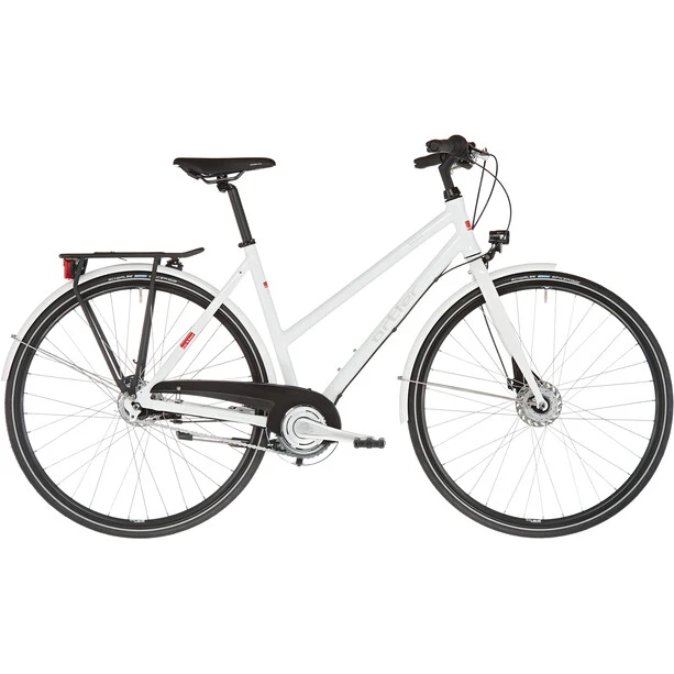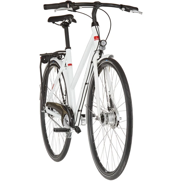 Un atout de plus : les pièces d’usure telles que la chaîne et les rayons sont, comme d’habitude en Scandinavie, fabriquées en acier inoxydable. Le vélo est équipé d’un feu arrière à LED sur le porte-bagages, d’une béquille robuste ainsi que d’un garde-chaîne et d’un éclairage avant à LED AXA.
