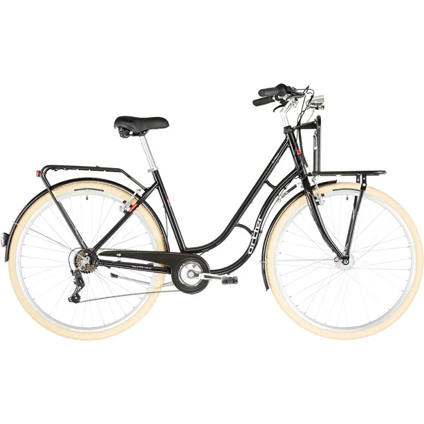 Le Detroit dispose d’un équipement complet pour la route, de jantes solides en aluminium et d’un roulement interne à cartouche sans entretien.Grâce à l’accès bas et à la grande plage de réglage du guidon et de la selle, les cyclistes de 1,55 m à 1,85 m se déplacent confortablement avec le cadre Ortler Detroit Unisize et un porte-bagages avant supplémentaire pour plus d’espace de rangement.