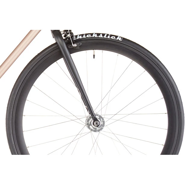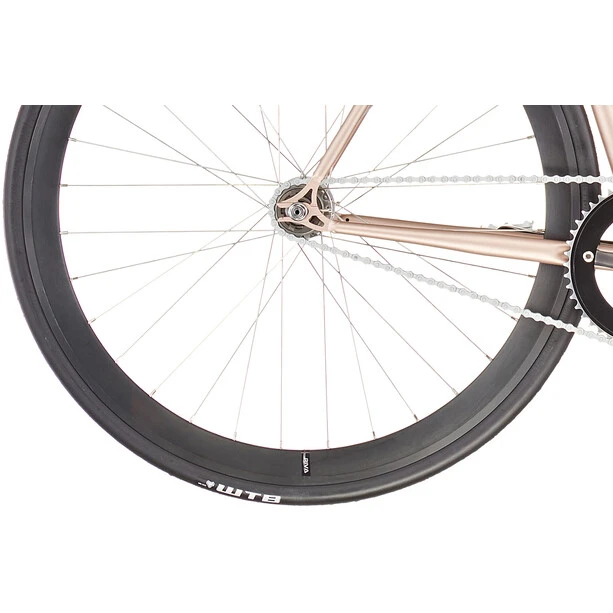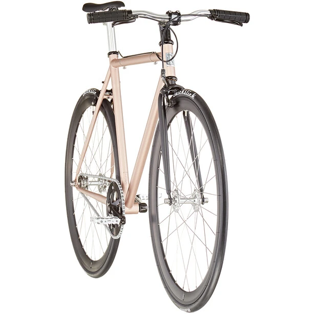 Que vous choisissiez le pignon fixe ou la monovitesse, les freins sur jante classiques à l’avant et à l’arrière assurent l’arrêt de votre vélo à tout moment.